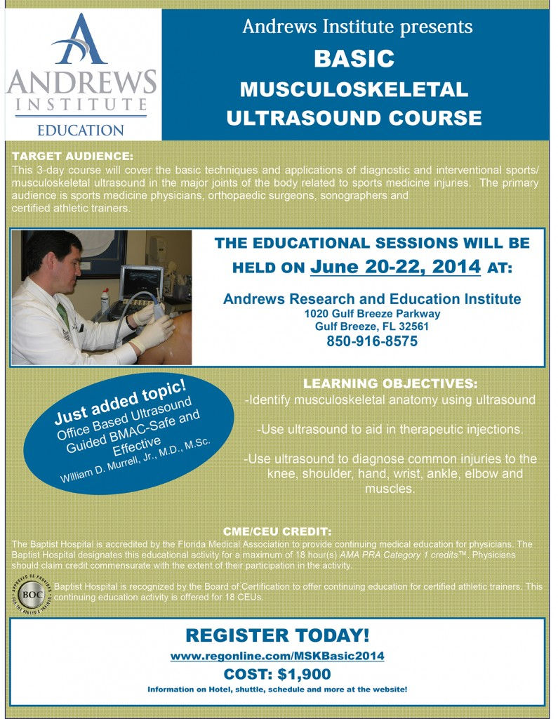 Dr. William Murrell invited to give a lecture in the upcoming Basic Musculoskeletal Ultrasound Course held on June 20-22, 2014 at the Andrews Research and Education Institute Gulf Breeze, Florida. Dr. Bill will be giving a lecture on Office Based Ultrasound Guided BMAC-Safe and Effective.